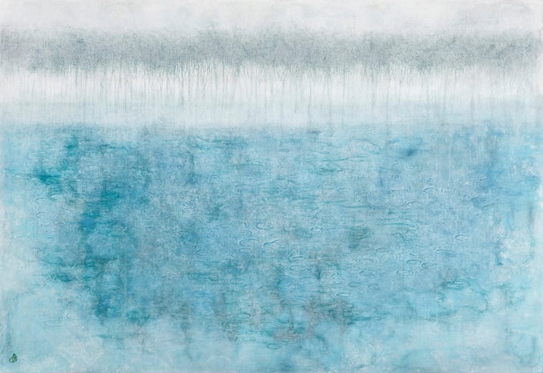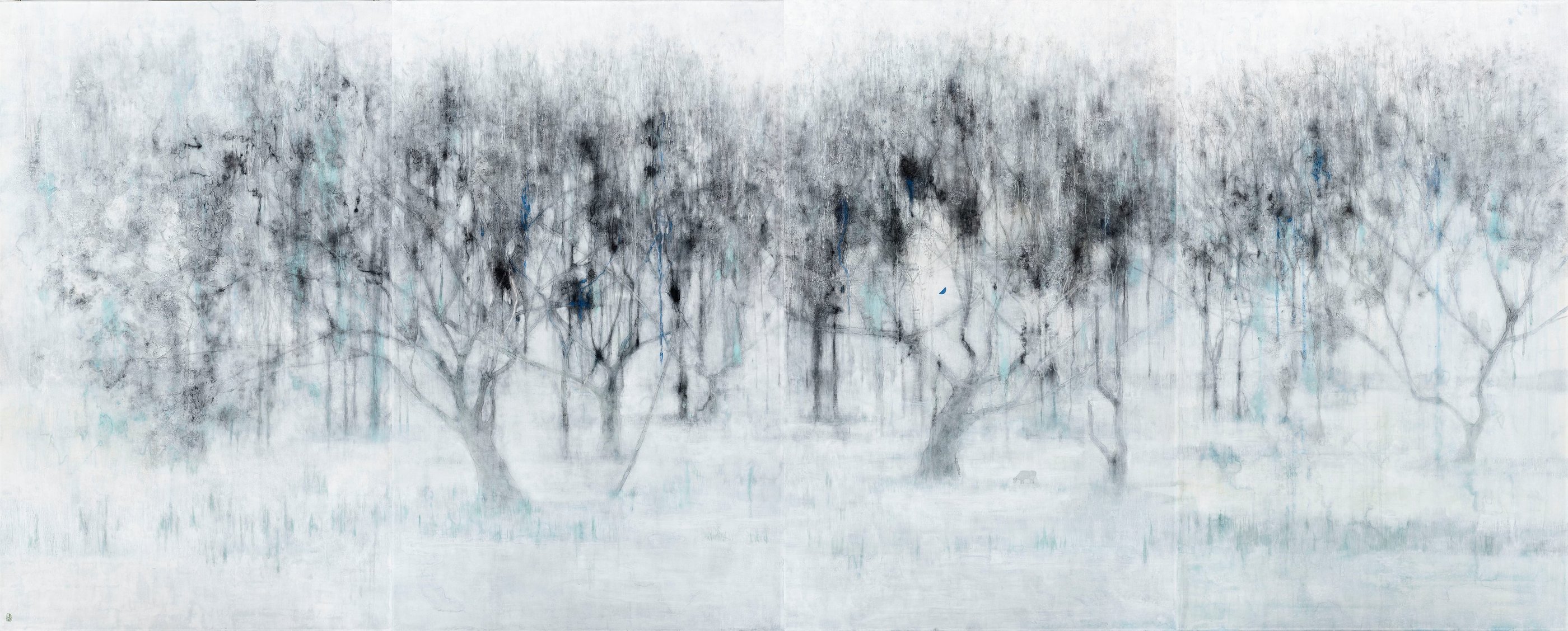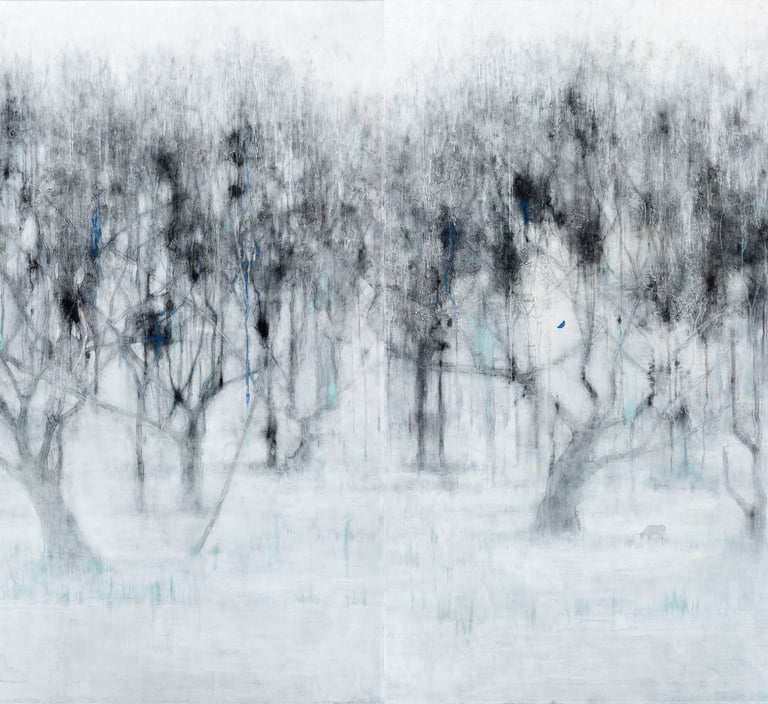 大自然的美,經常是美不勝收,無法用言語來形容。天地萬物間和諧的律動,不分彼此的相互交融共存,讓人感佩上天神奇的造物。而我親愛的夥伴林靖子,她的繪畫總是試圖捕捉大自然間彼此交融的那一個令人動容的瞬間。這是非常不容易的一項任務。前幾天收到她剛完成的新作,我想她又再度完成了一項艱困的任務。