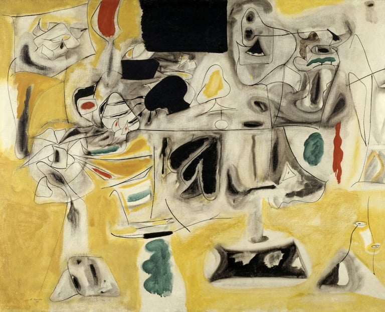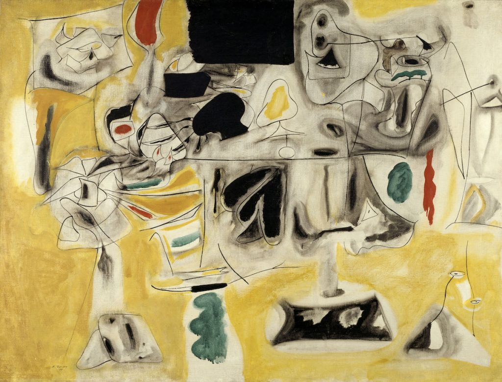 我記得自己是在多年前,從紐約著名的二手書店Strand Bookstore藝術書區的一本畫冊,開始認識戈爾基的藝術世界。當時主要是被他的一幅抽象畫吸引。〈桌上風景〉(Landscape-Table,1945),明亮的鮮黃色吸引著目光,灰黑的色塊以及勾勒其上的細黑線條,在畫面上看似工整的排列著,但卻又是流動且隨意的意象。當時乍看覺得和米羅的風格雷同,而色調又和康丁斯基相似,與印象中美國抽象繪畫的風格有落差,於是我產生了好奇心,待深入觀看,居然腦子裡充滿了遐想,似是盛夏中的廣袤草原,舒適自在。令我興奮的是,我感受到了作者的心靈風景:恬靜的田園風光、歡樂的野餐、一處和樂融融的家⋯⋯我一向很喜歡這樣的抽象畫,感性溫柔,且又靈活生動。這次在威尼斯的展覽,廣告主打的就是這幅作品,我感到無比的開心,畢竟之前只看過畫冊上的圖。我的藝術行旅,常常讓我感受到自己的幸運。我感謝上蒼,因為祂總是讓我有機會和自己喜歡的藝術品,面對面地進行心靈的交流,祂總是讓我的精神世界無比富足。