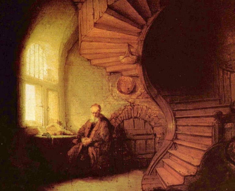林布蘭的《冥想的哲學家》,這幅畫是我特別有共鳴的,陽光從窗外灑進來,映照著一位沉思的老人,他彷彿在追尋某一種,超越日常的真理。而畫面中央的螺旋階梯,像是一條靈魂的道路,引領我們走向思想的高處,而右邊角落裡的婦人,則提醒著:「生活的現實從未遠離我們。」林布蘭用光影描繪出「思想」與「日常」的兩個世界。站在畫前,我也總會問自己:「此刻,我正走在怎樣的一條道路上面呢?」