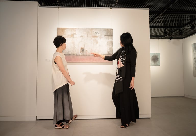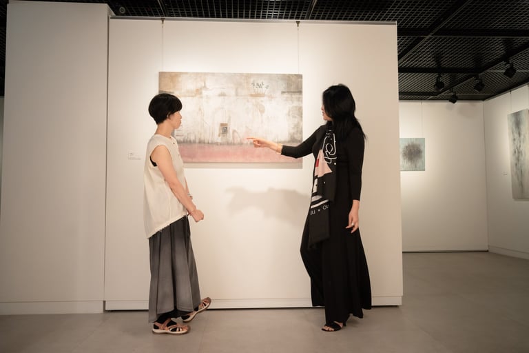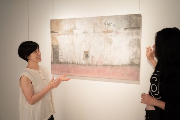 畫面有著大片的粉紅,整幅畫充滿著很可愛的歡愉感。靖子笑著告訴我,這是她最喜歡的草莓牛奶的顏色,啊,我認識她這麼久還不知道原來她偶爾在畫裡加入的粉紅色,來自草莓牛奶呀!這種粉紅不僅迷人,同時會帶給人幸福,徜徉在這樣的粉紅世界裡,應該會很快樂吧!她偷偷地告訴我:「她從小就喜歡粉紅色,因為這是一個幸福的顏色!」原來,白色的牛奶對我來說是帶來滿滿幸福的顏色,靖子則是草莓牛奶的粉紅色⋯⋯那麼,為各位朋友帶來幸福的顏色,又是什麼顏色呢?
