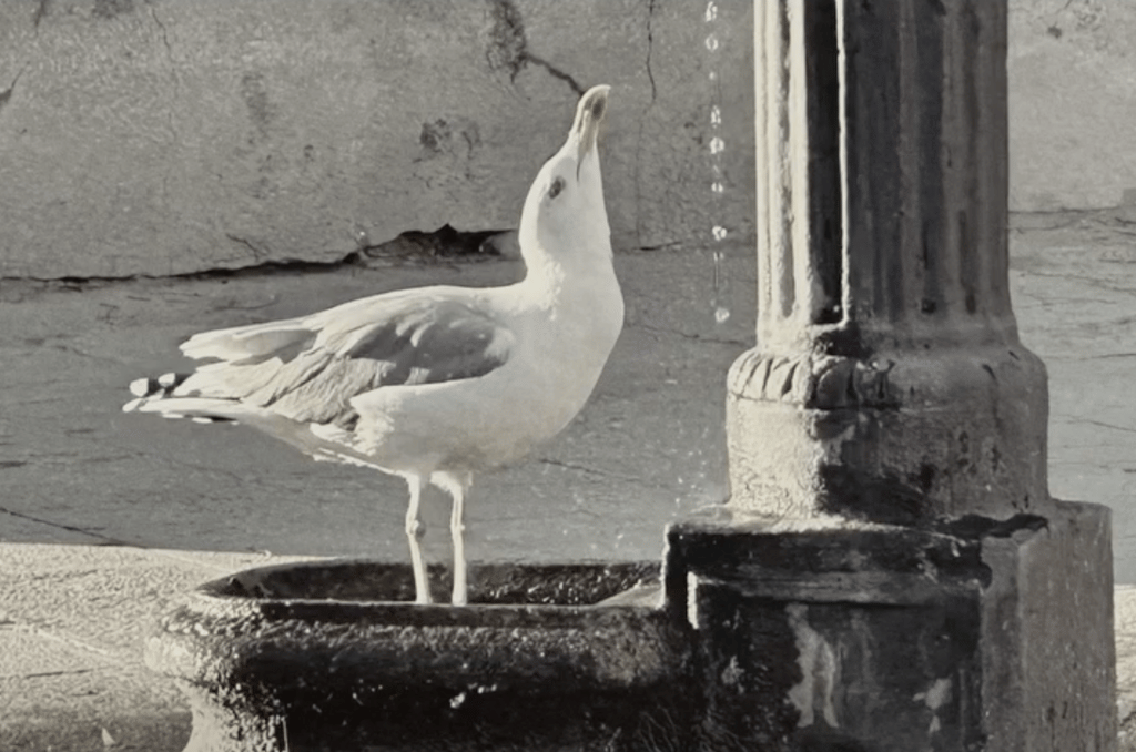📖 威尼斯的午後在威尼斯,海鷗真的像居民一樣。牠們不僅在天上飛,也會在屋頂上叫、在水邊散步,甚至會可惡地咬爛居民的垃圾,讓當地人頗為頭疼。但有時,牠們也會像這樣:在午後的陽光裡,自己走來喝一口水。我看著牠抬頭、認真喝水的樣子,覺得很可愛。這就是城市與生命,共同生活的樣子。
