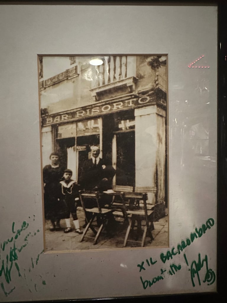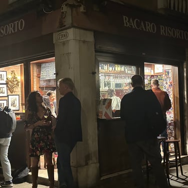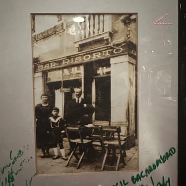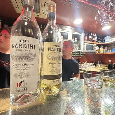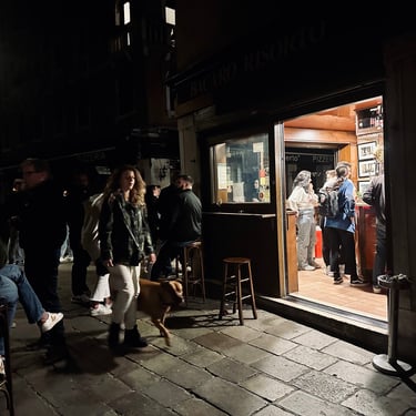 這是去年的事了。當時因為岑老師在威尼斯的展覽,我在聖馬可廣場附近的公寓住了三個月。Bacaro Risorto 離我住的地方不遠,於是有時候吃完晚餐後,我會散步到那裡,喝上一杯飯後酒。這家小酒館對我來說並不陌生——2019年,我曾因為岑老師的展覽策劃常駐 Castello 區,而這家酒館剛好就在附近。那時候,下班後來這裡喝一杯 Spritz 已成習慣。而這一次,因為是晚飯後前來,我改喝義大利的白蘭地 Grappa。