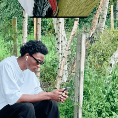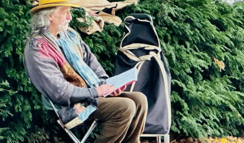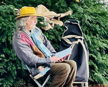 拐個彎,在一排濃密綠叢前,我看見一位街頭詩人。他戴著黃色的帽子,身披繽紛圍巾,坐在折椅上書寫著。他的存在,彷彿是一幅靜止的畫,也是一段流動的詩。