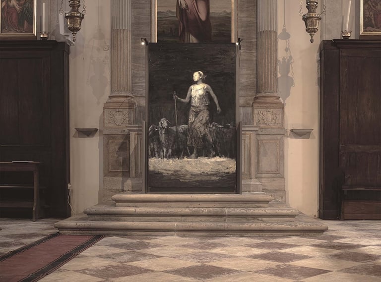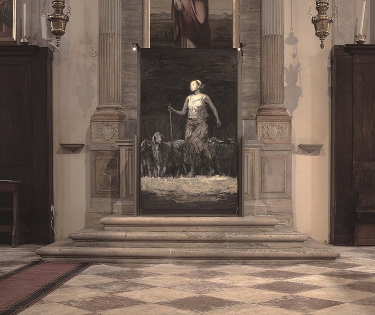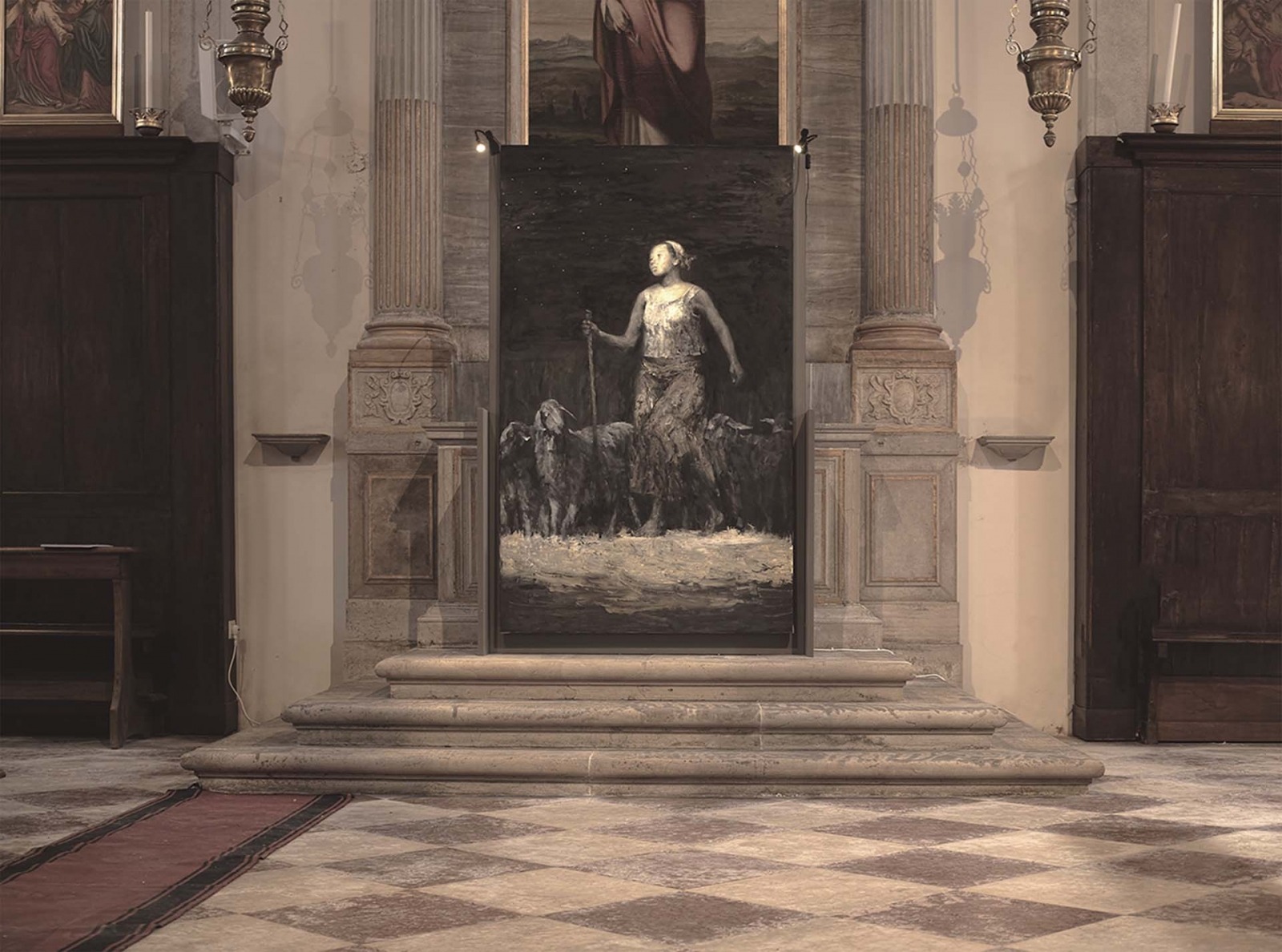 記得2019年於威尼斯馬爾他聖若望教堂所策劃展覽「蒼穹星光—岑龍和他的藝術」,其重要作品之一《蒼穹星光》(2019)裡閃亮的星光眷顧著辛勤的牧羊女,在暗夜中照亮回家的道路。抬頭仰望星空的少女感受到上蒼對她的憐愛,因而無懼大自然艱困的考驗,這就是堅定的信仰對於人性所產生的巨大影響力。岑龍為畫面營造了無所不在的光,隱藏了慈悲善良的造物者,這裡有一條通往上天、肉眼看不到的通道。