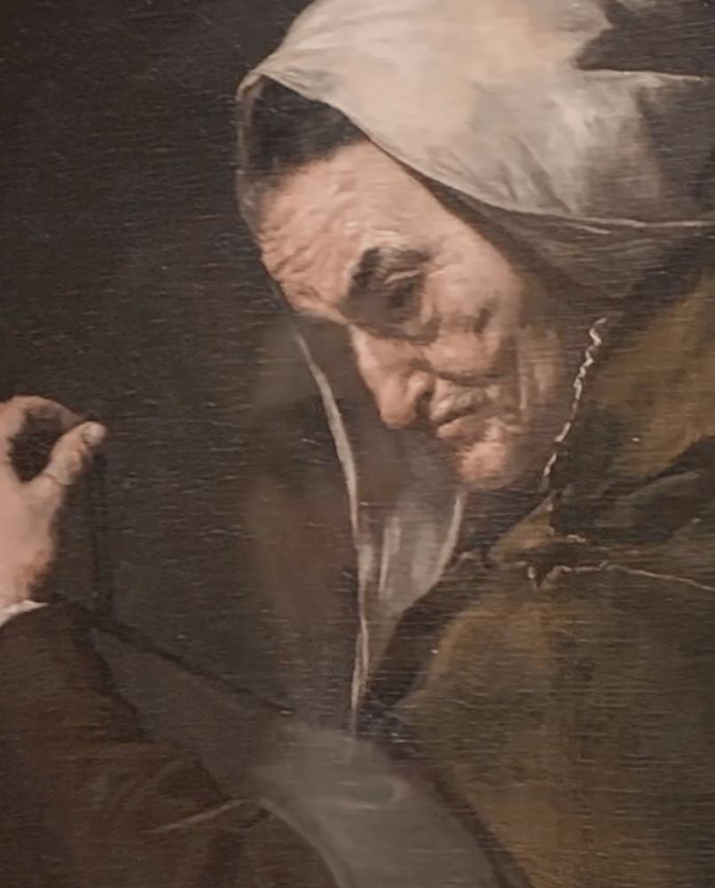 這幅畫,名為《老放債人》。畫中是一位年邁的女子,低頭看著手中的秤,她的神情既精明,又透著一絲疲憊與冷漠。她秤的,也許是金錢,也許是別人的命運。