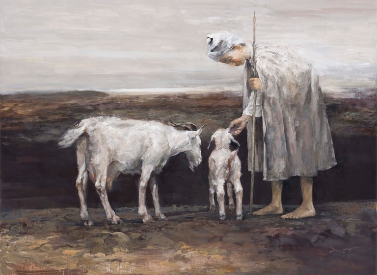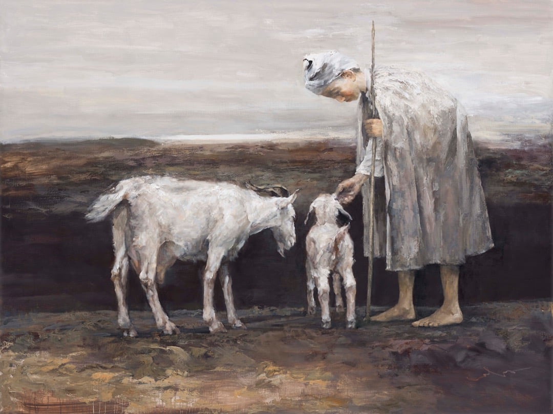 在這裡,我想談一下岑龍的〈遠山〉(2015),一望無際的貧瘠田野上,牧羊女輕撫山羊,溫柔的給予愛憐。人類和動物相互依偎的情感,在浩瀚的廣袤空間中緩緩道來,畫面的構圖賦予牧羊女如史詩英雄般的形象,同時將這一瞬間的愛的交流凝聚在畫中,很令人感動。我相信這就是托爾斯泰所提倡的藝術必須是「宗教的」的意思,也就是藝術本身必須是具備能夠傳遞宗教帶給人的仁愛精神,透過堅定的信仰讓人在平凡的生活中克服困境,無所畏懼。岑龍的繪畫在這裡傳遞的是一種跨越宗教形式的良善與愛的力量,我相信,如果是本身具有堅定宗教信仰的觀眾應該能夠從這幅畫中感受到一股來自浩瀚宇宙的關愛,進而淨化自身心靈,得到安慰。