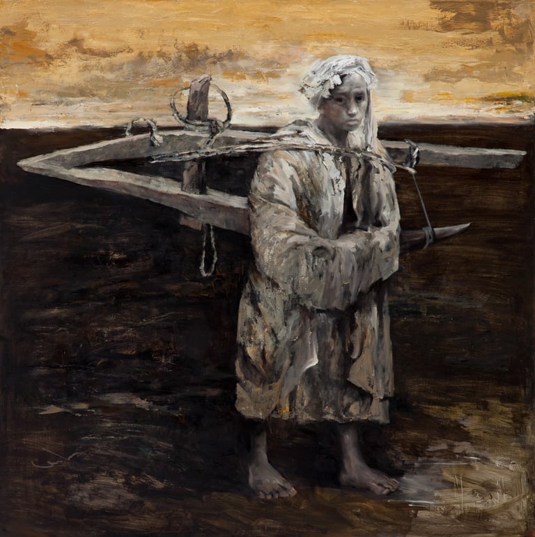 記得剛認識岑龍時,他曾說:「我希望我的畫看起來很平凡不起眼,但是觀眾看久了後會進到畫中,也許是笑也許是哭,但是都是深受感動的⋯⋯」這些年來,我的確接觸過許多深受岑龍作品感動的觀眾,有人在畫前落淚,有人在畫前思索生命的真諦,也有如我般之人,因深受感動而努力不懈推廣他的藝術。真摯而偉大的情感總是在平凡的一瞬間表露出來的,尤其是母愛。〈歸途〉(2018)同樣令人動容,雷雨即將來臨,母親帶著孩子趕緊回家,儘管身上背負沈重無比的麥稈,但她依舊努力照顧孩子為生活奮鬥。站在畫前,可以感受到山雨欲來前的緊張,以及麥稈沈重的負荷,母子看起來是弱小卻強壯的,而上方的光線帶來的是上天的光。