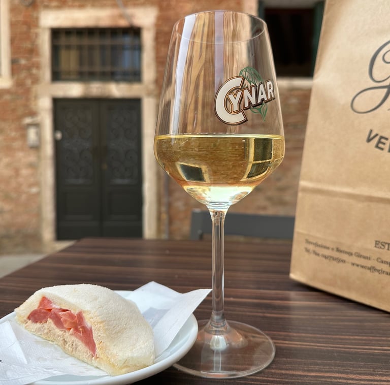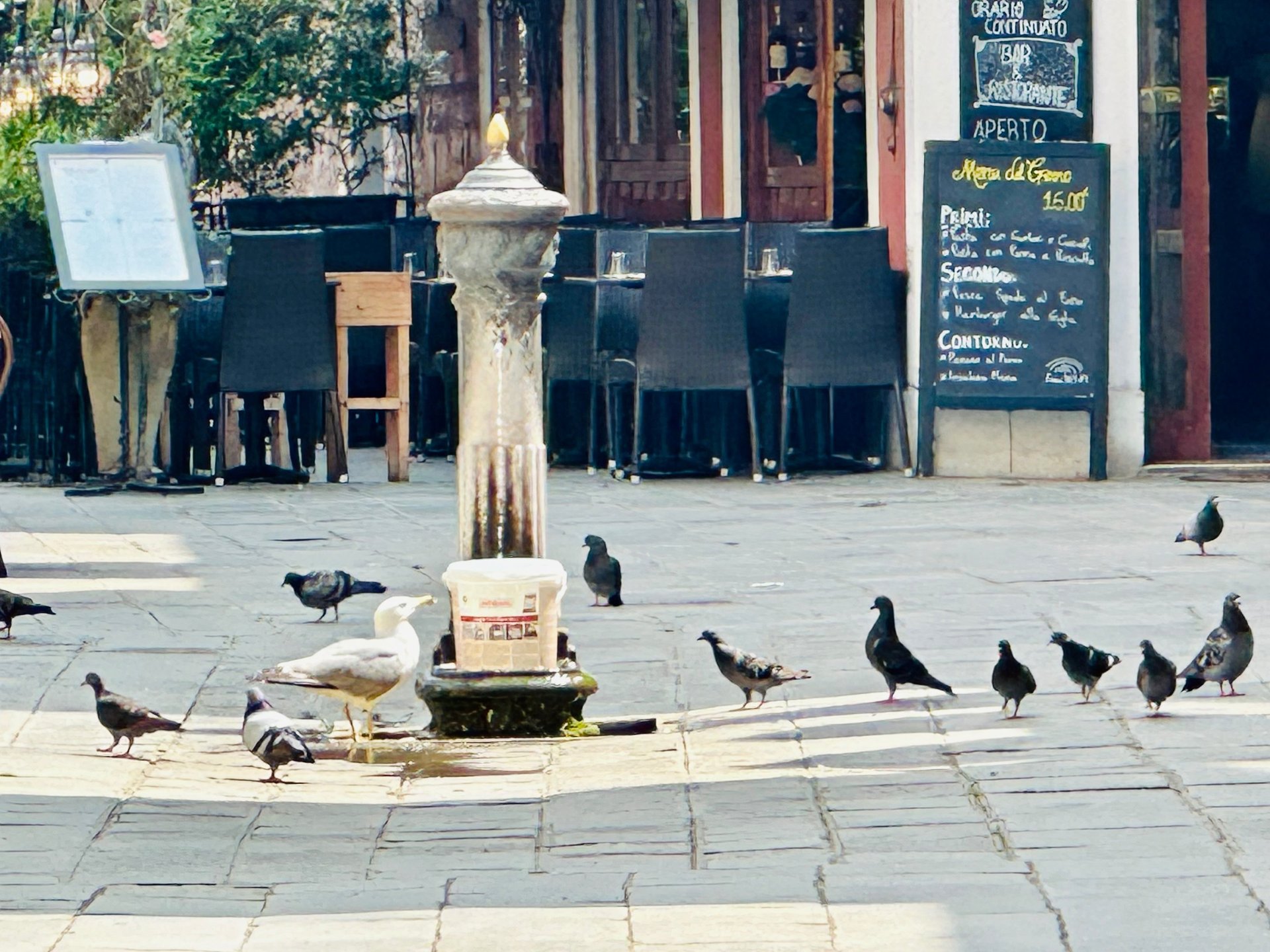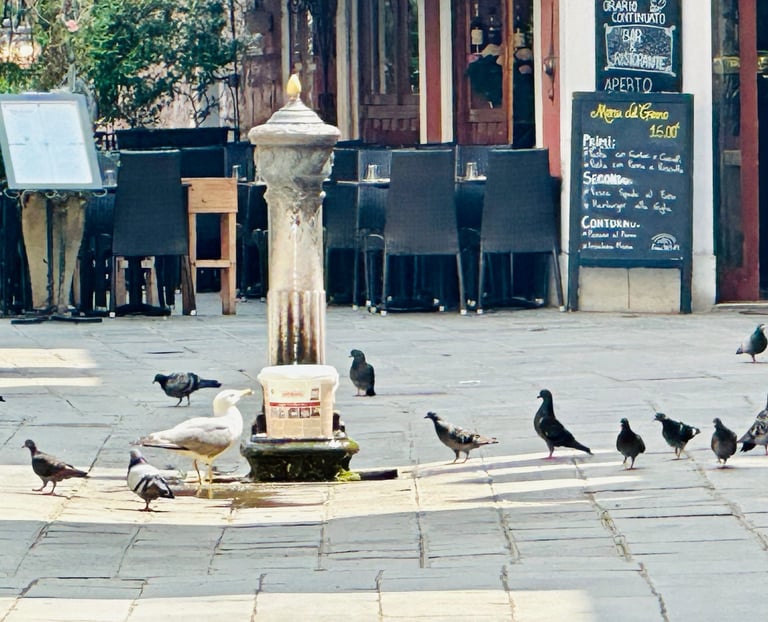 今天九點多起床,想喝杯卡布奇諾,順便去廣場曝太陽,看海鷗、鴿子和船隻穿梭。 天氣很熱,我有點口渴,就去了附近一家我常去的酒吧,點了杯Prosecco和一份番茄鮪魚口味 的Tramezzino。坐在戶外,看著時間才十一點初頭,我已經在喝酒了。平常在台灣或美國我不會這樣,但在