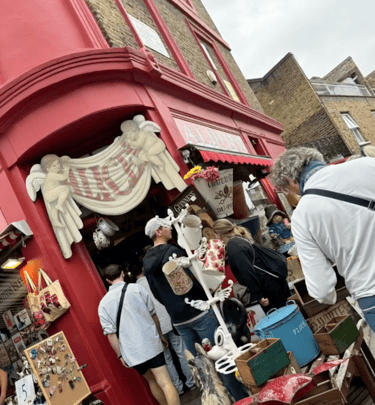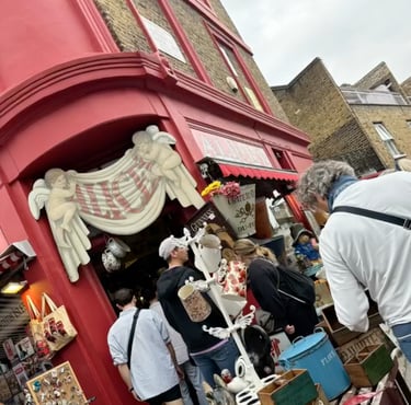 我最喜歡停在畫作、舊書和首飾櫃前,看那些帶著歲月痕跡的東西,單純欣賞它們的美。即使今天時而下雨,街上依然是撐傘逛市集的人潮。這樣的景象,已經成了我心裡對倫敦週六的印象。