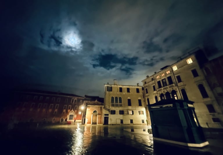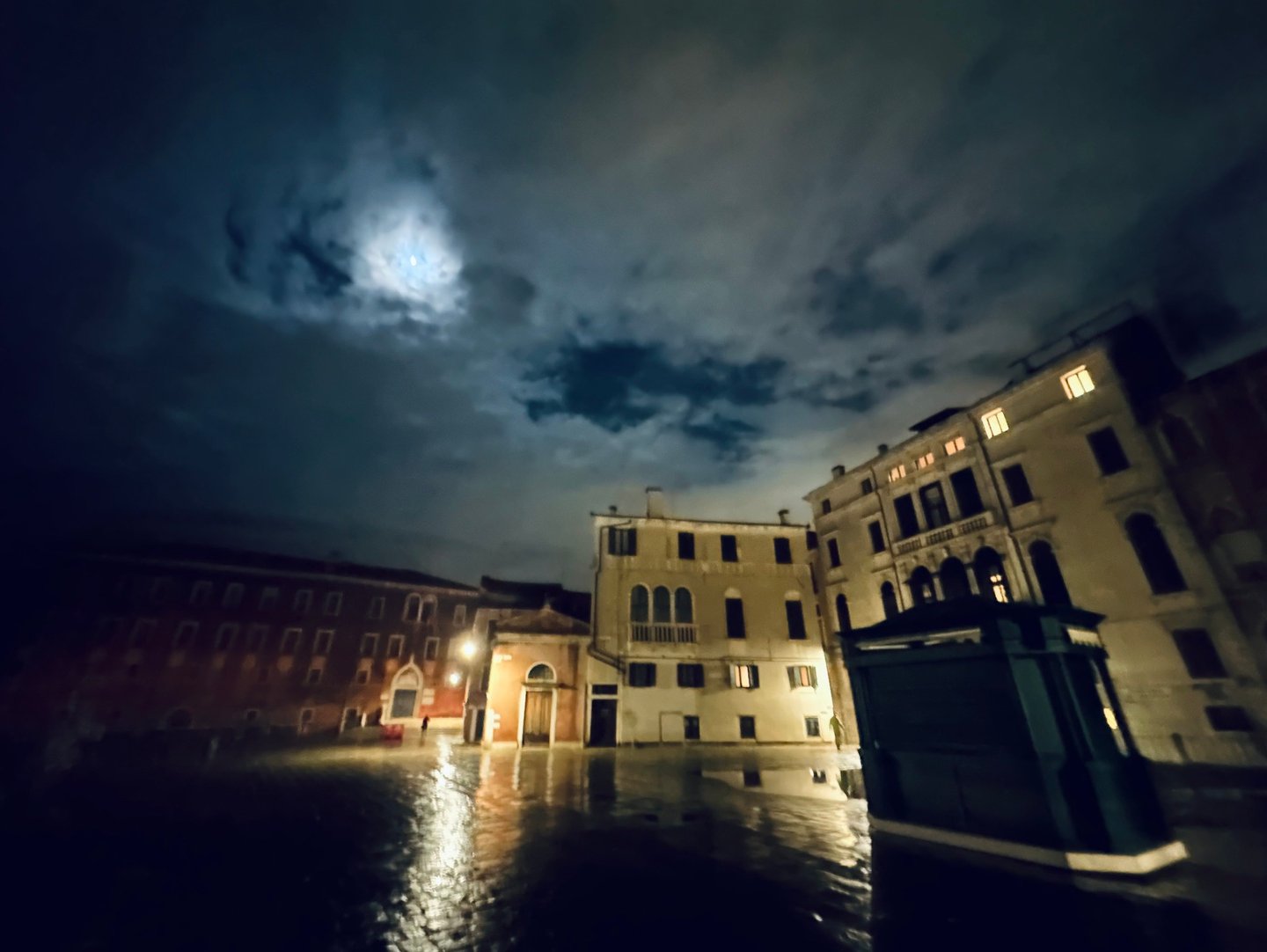 某個夜晚,大約在4月10日左右,布展完成後,我獨自走在Frari大教堂附近的街道上。在一座橋上,我順著光影望向遠方,看到小橋和古老的建築,美不勝收。耳邊傳來的潺潺流水聲為這一幕增添了動人的配樂,讓我產生了一種深深的依戀之情,意識到自己難以割捨對威尼斯的情感。