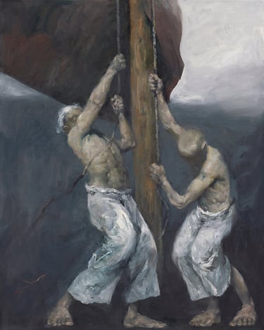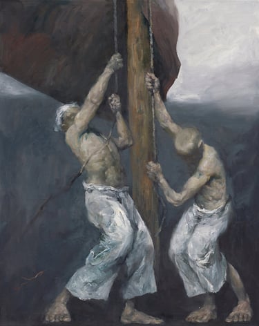 到了〈起風的日子〉,光彷彿不再來自天空,而是自人物的身體與意志中被撐起。世界以沉重的形式壓向他們,而他們以自身的亮度承受、對抗,並在失衡之中維持與宇宙的連結。這不是自我照亮,而是一種在重量之下仍不崩解的節奏;主體不再只是被世界照射,而是在承重之中,成為與世界共振的一個光點。