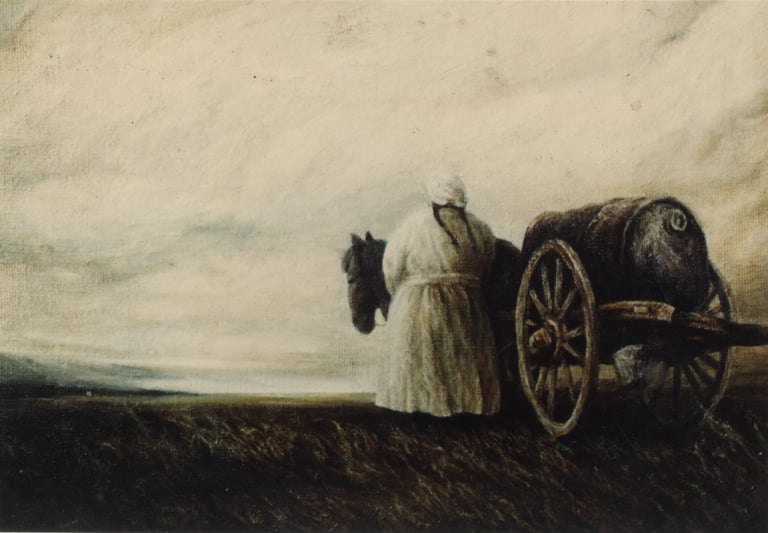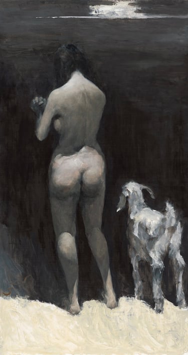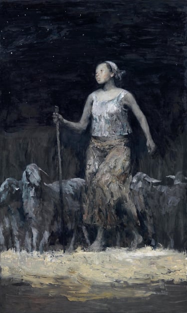 在〈遠山〉中,光不再作用於任何人物,而是作為世界本身的場域存在。山脈、天空與地平線被一層均質而安靜的亮度包覆,使觀看不再集中於某個對象,而是進入一種與整體共在的狀態。那樣的畫面不是風景,而更像是一個宇宙的呼吸,讓人暫時忘記自身的重量,成為其中的一部分。在〈蒼穹星光〉裡,光被壓縮至幾乎消失。人物與背景一同沉入夜色,卻仍被一種極微弱的亮度所維繫。那不是照明,而是一種使存在不被抹除的力量。即使在最接近虛無的時刻,世界仍然以光的形式,輕輕托住每一個尚未消失的身影。